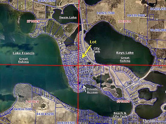 Beautiful ready to build lots in newer development on the outskirts of Elysian MN. All utilities are present. Amazing views of Lake Francis and Rays Lake. City park and playground nearby. Lake Francis is southern MNs premiere recreational lake. Very clean and great water clarity. 70 feet deep. Great fishing for all species, including walleye and bass. Access to lake via private landing. Each lot includes 1/85th ownership of small park and boat launch on Francis. Rays Lake is also very clean and great fishing. Nine different lots to choose from depending on which exposure you prefer. Most in cul de sacs. Don't miss this opportunity to build your dream home in a country setting on the edge of MNs best kept secret.....Elysian. These are NOT Lake Front properties. They are Lake View with shared access to a private launch owned by the association. $50 per year association fee. 9 lots to choose from as seen in photos. Each lot is priced at $39,000. Email, call or text Scott at 507-323-5411.