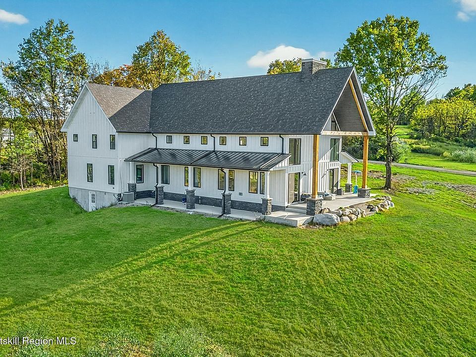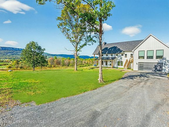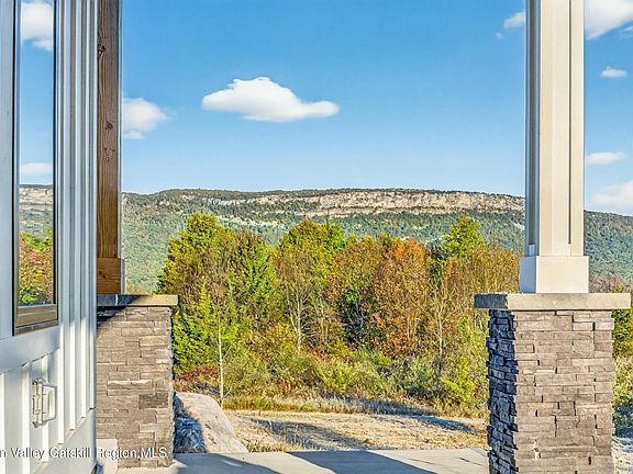 Nestled on a peaceful road with breathtaking views of the Shawangunk Ridge and Mohonk Tower, this stunning modern farmhouse offers 4,862 square feet of sophisticated living space across five bedrooms and four and a half bathrooms. The heart of this home is the magnificent great room, featuring soaring 36-foot ceilings and a propane fireplace that perfectly frames the spectacular mountain panorama beyond. The chef's kitchen is a culinary dream, showcasing café-grade appliances, gleaming quartz countertops, and a generous island that invites both casual meals and elaborate entertaining. The thoughtful open floor plan seamlessly connects living spaces while maintaining distinct areas for relaxation and gathering. The first floor primary suite provides a luxurious retreat with a soaking tub, double vanity, and spacious walk-in closet. Also conveniently located on the main level are the laundry room, home gym, and powder room. Upstairs, a dramatic loft overlooks the great room below, while a full bathroom serves the Jack and Jill bedrooms, each with separate vanity areas. The show-stopping upstairs primary bedroom boasts vaulted cathedral ceilings, panoramic mountain views, a cozy electric fireplace, and an extravagant bathroom featuring beautiful tilework and a soaking tub that gazes into private woods. Additionally upstairs features a spacious home office with its own entrance - perfect for remote work or creative pursuits. This exceptional location provides easy access to outdoor adventures at Minnewaska State Park Preserve, local wineries, and the charming nearby towns of New Paltz and Gardiner. Whether you're hiking, climbing, biking, or exploring farmers' markets, endless recreation awaits. Plus, commuting to New York City remains surprisingly convenient, making this the perfect blend of mountain tranquility and urban accessibility.