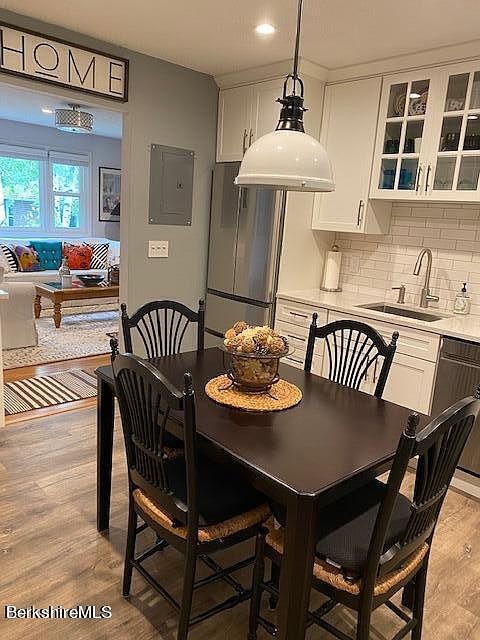 Walk to town end unit with 1 bedroom, 1 bathroom, 725 sq ft with windows on 3 sides along with 1 car garage and two storage rooms, one in the garage and one in the basement with interior access. Hardwood floors. Washer and dryer in the unit. Custom designed kitchen in 2019 includes ceiling height solid wood white shaker cabinets, with crown molding, & upgraded cabinet pulls. Quartz countertops, with white subway tile backsplash. Stainless steel appliances, built in fridge, slide in gas stove. 10'' deep stainless-steel sink, with high end Moen faucet. All electrical wiring along with plumbing redone. Six recessed LED spotlights in the kitchen, 6 in the living room, one in the bathroom over the tub, all are on dimmers. Ceiling light fixtures installed in all rooms; recessed spotlights installed May 2022. Custom designed bathroom with solid wood 48" vanity with Carrara marble top, & 8 drawers. High end Moen faucets and fixtures in polished nickel. White subway tile in shower/tub with recessed shelf. Solid wood wainscoting paneling, and a solid wood paneled 8' door to the linen closet. Mannington waterproof, insulated vinyl wood grain plank flooring in kitchen and bathroom. HOA fee of $534 includes heat & hot water, gas for cooking, cable TV, high speed internet, building & grounds maintenance, & master Insurance water & sewer.