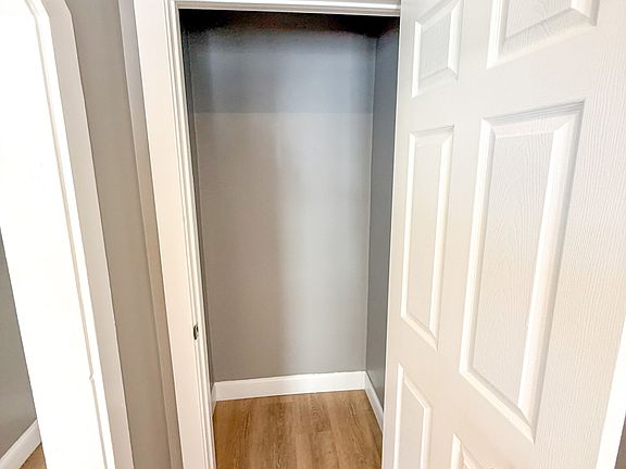 - Beautiful wood-look laminate flooring in chic gray tones runs throughout.