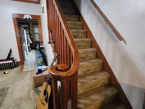 Rowhome charm with original woodwork! First floor offers living room and dining room as well as the kitchen and access to the basement. The second floor has three bedrooms with closets and a full bath. The third floor is one bedroom plus storage. It also has a and a rear detached garage which is very rear in this area!!! This property also has a rear patio and maintainable yard. It is a must see for easy living.