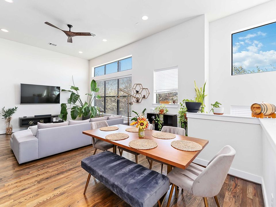 Rich hardwood floorsAbundant natural lightStainless steel appliancesBright open-concept living spaceQuartz countertopsSleek kitchenSoaking tub