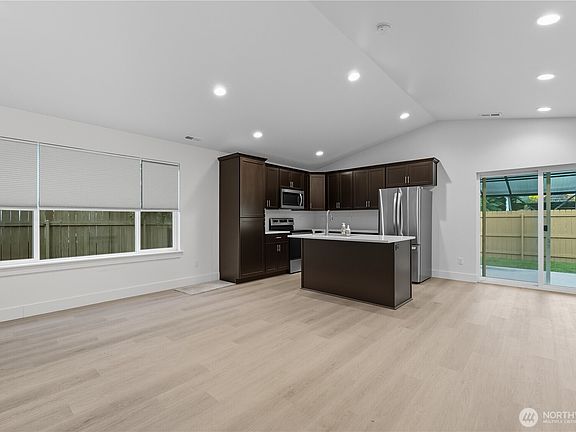 This 2023 built rambler features three bedrooms, two full bathrooms, a two-car garage and 1,332 sqft of living space. Inside the open main living space has vaulted ceilings, luxury vinyl plank flooring, quartz countertops, subway tile backsplash, soft close cabinets, stainless appliances and pantry cabinet. Three bedrooms are a split design with two secondary bedrooms at front of the home, and primary suite off the living room. Bedrooms has carpet with an upgraded carpet pad, extra tall white trim and recessed lighting. The primary has an ensuite bath with an over-sized single vanity and a huge walk-in closet. Moving outside you’ll find full front and backyard landscaping, full fencing, lap siding and a concrete pad back patio.