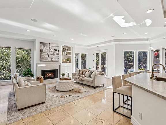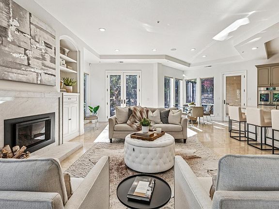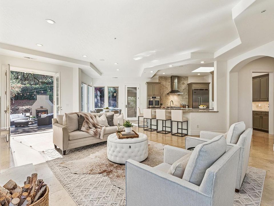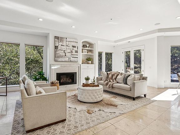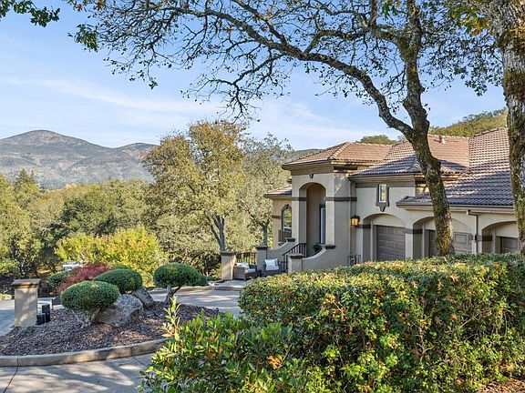 Nestled in an enclave of custom homes with all city services minutes to downtown Napa, this mostly single-level home showcases stunning views of Mt George & beautiful oak studded grounds with natural boulder outcroppings. Highly desirable floor plan featuring primary ensuite & all living areas on main level. Spacious great room offers family room with gas fireplace opening to gourmet kitchen with stainless appliances, large center island with counter seating, informal dining area & French doors with access to expansive outdoor entertaining area with bistro lighting. Relax by the gas fireplace & unwind by the tranquil water feature surrounded by majestic oaks & natural rock outcroppings. Luxurious primary ensuite includes its own fireplace, cozy seating area, spa-like bath, huge walk-in closet, views of & French doors that open to the extraordinary grounds. Perfect for entertaining or extended family stays with lower level featuring 1500+/- bottle temperature-controlled wine cellar & 3 additional BRs with separate entrance, ideal for guests or multigenerational living. French doors throughout create seamless indoor-outdoor living opening to outdoor seating, entertaining & dining areas. Whole house owned solar & generator, 3 car garage with EV charger & more!