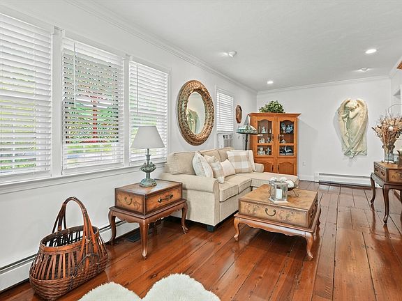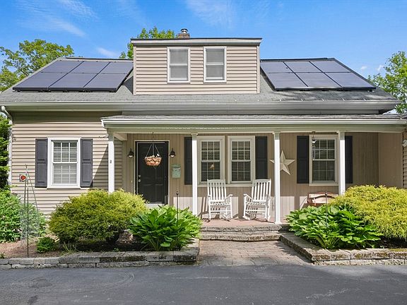 Welcome home to this charming 3-bedroom, 1.5-bath Cape set on over 2 acres near forests and conservation land. The main level features hardwood floors and recessed lighting, flowing from the spacious living room into the bright dining area and chef’s kitchen, complete with white cabinetry, granite countertops, gas range, stainless appliances, breakfast bar, and pantry. A tiled three-season room opens to an expansive back deck, while a bonus room with sliders offers additional access to the outdoors. A carpeted office, tiled full bath with shower, and laundry room round out this floor. Upstairs you'll find three bedrooms and a convenient half bath. A 3-bay garage with an attached barn-style shed, large driveway, and solar panels provide space and efficiency. A newer boiler with three heat zones adds value. The beautiful, open backyard is perfect for relaxing or entertaining. Schedule your showing today!