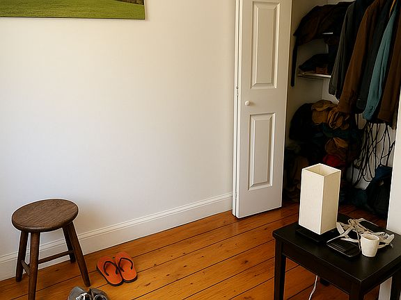 The living room is warm and inviting, while the bedroom is best suited for a smaller bed setup. Residents also enjoy access to the building's private garden, an ideal spot for reading, relaxing, or simply soaking in the quiet beauty of this special enclave.