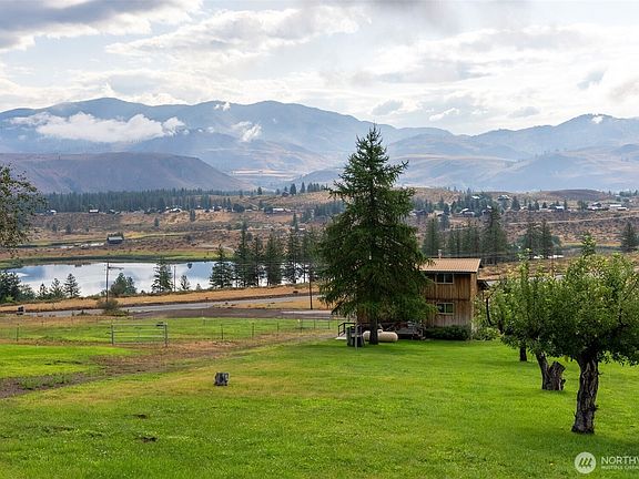Twin Lakes View Home on 5+ Acres - just south of Winthrop, this 2 bedroom home overlooks Twin Lakes with sweeping views from front deck. The property features a spacious yard with fruit trees, garden area and direct western border with State Land. Practical amenities include an attached one car garage on the lower level and large equipment storage shed uphill from house. Handicap ramp on 2nd level. Enjoy close access to Patterson Lake, Sun Mountain Lodge and all the outdoor recreation the Methow Valley has to offer. Can receive internet connection.