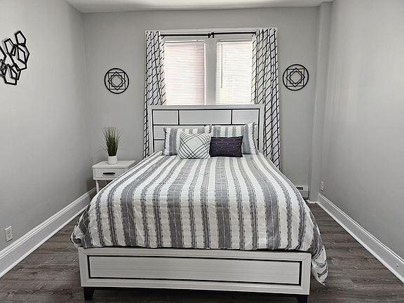 Queen Bed, 6 Dresser draw, Stand up mirror, side table, 50 inch smart wall mounted TV, pillow-top mattress, Locks and key, blackout curtains. Desk and chair provided if needed in your bedroom.