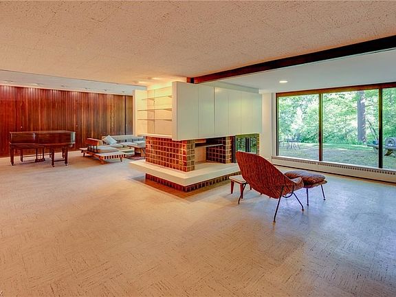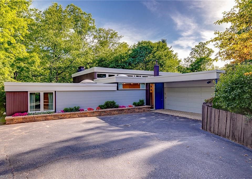 A unique Mid-Century Modern home on a spectacular property with pond and hillside views set in the intimate and desirable community of Pepper Ridge.Walking trails lead to the common land, pool, tennis court and playing field. This is a Robert Little designed home with 4000 square feet of living space, one-bedroom suite and bath on first and 4/5 bedrooms and 2.5 baths on second. First floor room that served as an art gallery beckons to the serious collector or an ordinary art enthusiast or to someone whose imagination suggests a novel use for graciously lit and easily repurposed space. A panorama of southern windows showcases an intricate landscape as beautiful as any that Northeast Ohio has to offer! This home has been extensively and thoughtfully renovated with attention to the preservation of original woodwork and built-in features even as some walls were removed to create an open flow of first-floor space. First floor 34x11 living room and 25x25 family room share a dual fireplace with views to the pond. Kitchen has a modern center island with view to the back yard (birds abound). Features also include small greenhouse, a carport in addition to two car garage and tool shed. Privacy, stately trees and a beautiful immersion in nature are at the heart of this sophisticated modern home.