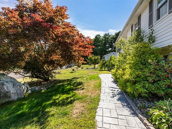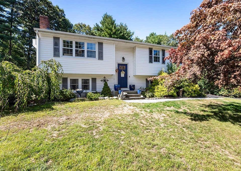 Beautifully updated home featuring a bright open floor plan on both levels in an ideal location—nestled in a neighborhood yet minutes to shops, dining, scenic Lake Mirimichi, and just 5 miles to Gillette Stadium! The spacious living room impresses with a vaulted ceiling and newer hardwoods that flow into the hall, open to the eat-in kitchen adorned with granite counters, crown molding, tile backsplash, white cabinetry, stainless steel appliances and a slider to the deck that overlooks the wooded backyard. The nicely renovated bath boasts a granite top vanity, shiplap & Hollywood access to the roomy primary bedroom. Two additional ample sized bedrooms complete the main level. Downstairs, relax by the fireplace in the family room open to a large finished flex space with laundry. A utility room and a 2-car garage complete this level. Major updates/replacements include roof, oil tank, garage doors, slider, flooring, 2-panel doors & walkway. A wonderful place to call home!