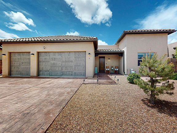 Kiva fireplaceThree-car garagePitched tiled roofEight-foot-high entry doorLandscaped front yard