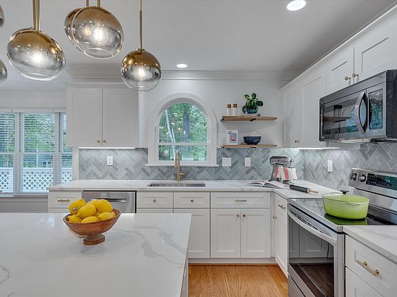 Tucked away on a cul-de-sac in the Woodlake neighborhood, 6 Placid Ct invites you in with hardwood floors leading back to the beautifully renovated kitchen where you will find expertly selected quartz countertops, a jaw-dropping textured backsplash, a large kitchen island, built-in coffee station, & stainless steel appliances. The other side of the kitchen table opens up unto a family room, complete with a fireplace that adds that extra cozy touch. The front room, connected to the kitchen by a work nook with a window view, is the perfect flex space for a den, dining room, or even a hobby station. Upstairs you'll find the oversized primary bedroom with a walk-in closet and updated primary bath fitted with modern fixtures and a quartz countertop on the wide double vanity. Two large second bedrooms provide plenty of room for everyone to relax and stretch out comfortably. There is no shortage of additional storage with two fully floored pull-down attics plus a 2-car garage that, yes, actually fits two cars. Doors in the family room and kitchen lead to the large deck, making entertaining easy when the gang comes over for a Saturday BBQ or game day gathering. Head down the steps to the koi pond for some extra peace and quiet or break out the fire pit for s'mores & stories under the stars. As a Woodlake resident, you'll enjoy a neighborhood pool, a clubhouse, over 3 miles of paved trails, two beautiful lakes, and the extra perk of being so close to Piney Wood park. Shopping and dining at Southpoint is just minutes away, plus easy access to I-40, RTP, and Chapel Hill means that there is absolutely nothing out of reach.