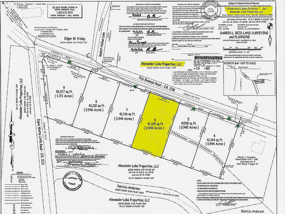 LOT #6 of "Anderson Lake Estates"/NC PIN#: 3746113442--newly developed lots. Enjoy a nice spacious lot offering 0.944 Acres. Public water available at street for buyer to tap onto, septic tank will be needed (buyer to do perc test with Alex. County Environmental Health). Restrictions (in Associated Docs) require size requirements to be 2100 sqft for a single story dwelling or no less than 2600 sqft for any 2 story dwelling--see DB: 666/PGS: 2383-2389 for all info. Setback requirements as per county zoning--40' front, 15' side, 40' rear, (20' if side street) - See PLAT Bk: 19/PG: 95 (in Associated Docs). Great location and close to Lake Hickory. Build your dream home here! *There is a farm nearby as well as chicken houses*.