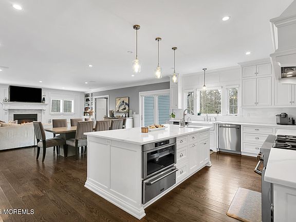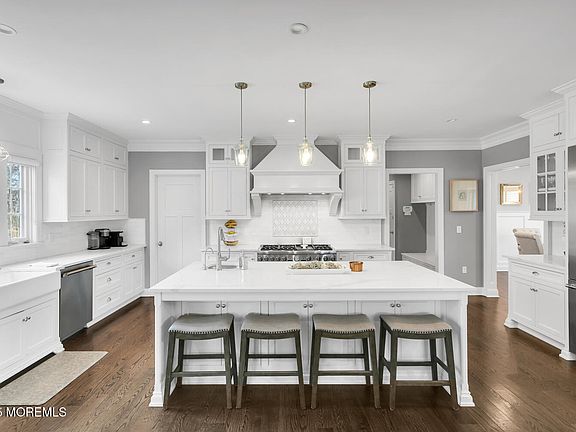 You are going to fall in love with this house. Perfectly set at the end of a quiet cul-de-sac just a short bike ride to Sea Bright Beach and in one of Rumson's most coveted neighborhoods. Beautifully appointed Seashore inspired colonial w/ sophisticated details and a fantastic open floor plan. High ceilings, oversized windows and fantastic natural light throughout. A gourmet chef's dream kitchen with an oversized center island offering ample seating, custom cabinetry, professional grade appliances, walk-in pantry with custom built-ins and a large breakfast area - all open to an expansive family room with handsome gas fireplace. First floor bedroom suite with full bath presently purposed as a home theater. Gorgeous custom millwork including coffered ceilings and custom built-ins. Large bedrooms including a luxurious primary retreat complete with gas fireplace, Ritz-Carlton inspired private bath, coffee bar and amazing walk-in closet with custom built-ins and center island. Large closets, beautiful baths with designer selections and high end fixtures, second floor laundry room with cabinetry, sink and quartz counters. Second floor bonus room, mud room with furniture-like built-ins for storage, direct entry garage and so much more. Rear paver patio overlooking picturesque private yard. Minutes to NY Ferry, schools & beach!
