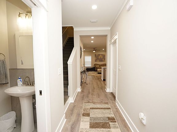 This two-story townhome offers a functional layout with all three bedrooms located upstairs. The spacious primary suite features a bathroom with double vanities, a walk-in shower, and a generous closet. Two additional bedrooms share a hallway bath, and the laundry area is also conveniently located on the second floor.