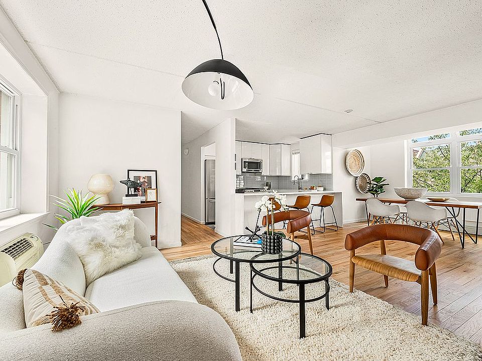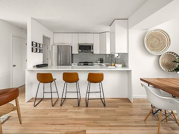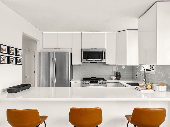 The generous living area is graced by two oversized south- and north-facing windows, which flood the space with natural light. An open, windowed kitchen is equipped with stainless steel appliances, including a dishwasher, microwave, and gas range, along with white quartz countertops, custom cabinetry, and a breakfast bar.