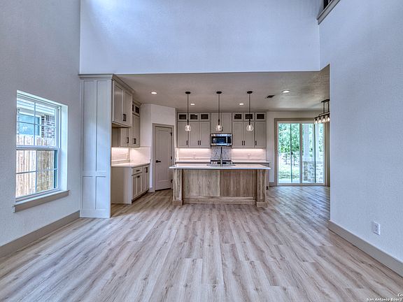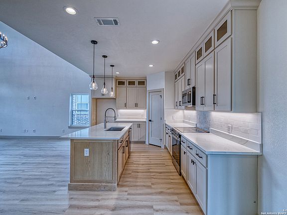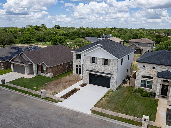 Welcome to 6 Rio Seco, a brand-new, never-lived-in custom home located in one of Uvalde's most desirable neighborhoods with no HOA. Recently completed, this two-story residence offers approximately 2,200 square feet of thoughtfully designed living space with three bedrooms and two and a half bathrooms. The location is ideal-less than a mile from three local schools and only three miles from the new hospital-making it perfect for families or anyone seeking convenience and comfort. The home features a striking stone and rock facade, a composition shingle roof, and a fully finished two-car garage. Inside, you are greeted with soaring two-story ceilings and an impressive decorative chandelier that creates a dramatic focal point in the living area. An iron-railed loft overlooks the main level and adds architectural elegance. Large windows throughout both floors bring in abundant natural light, enhancing the home's open and inviting atmosphere. The main level includes laminate flooring throughout the living spaces and bedrooms, tile in all showers, custom cabinetry in every room, and high-end designer light fixtures, faucets, and finishes. Dual AC units allow separate climate control for each floor, maximizing comfort year-round. The kitchen is a true showpiece with custom cabinets, a large quartz-topped island, designer lighting, and stainless steel appliances including an oven, microwave, and dishwasher. The open-concept layout flows seamlessly into the living and dining areas, making it perfect for gatherings and entertaining. A conveniently located half bathroom on the lower level adds extra functionality for guests. Upstairs, all three bedrooms offer privacy and thoughtful design. The two guest bedrooms include custom closets with built-in shoe storage. The guest bathroom is beautifully finished with a soaking tub, a separate glass-enclosed shower, and a double vanity. The spacious primary suite features abundant natural light, a large walk-in closet with custom cabinetry and a vanity area, and a luxurious primary bathroom with a double vanity, designer selections, and elegant gold hardware and lighting. Outside, the glass patio doors lead to a covered back patio equipped with an outdoor kitchen area, perfect for relaxing or entertaining. The backyard is level, privacy fenced, and features a mature mesquite tree as a natural focal point, with plenty of room for a pool or additional outdoor living space. This home is the perfect blend of modern style, custom craftsmanship, and functional design, offering exceptional living in a quiet, attractive Uvalde neighborhood with no HOA restrictions.