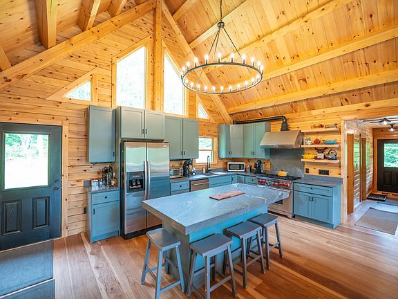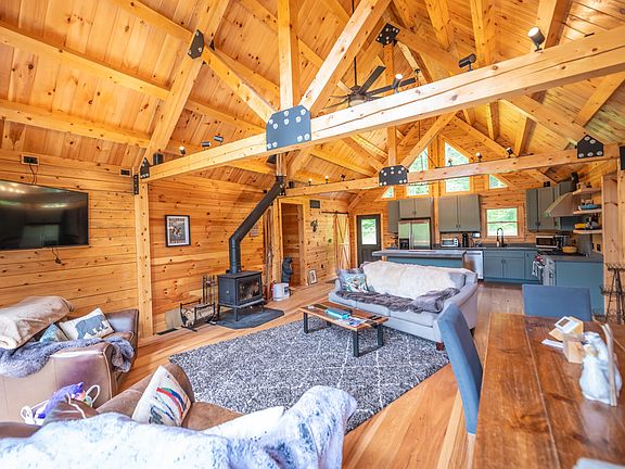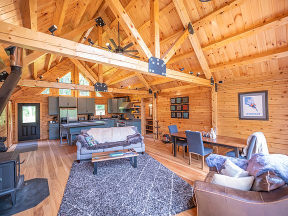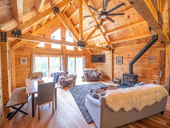 Brand new construction Moosehead Log Home on 2.3 acres just a short drive from Wilmington, the lakes, and the Mount Snow ski resort. This gorgeous rustic home was just finished and is ready for your immediate vacation enjoyment. At just a short drive out of the village of Wilmington, you are afforded easy access, yet a woodsy parcel reflecting Vermont living. Inside you are treated to a gorgeous vaulted great room with exposed wood throughout and a true Vermonty feel. There is a wood stove which creates the perfect ambiance after a day on the slopes. Additional features include a beautiful chefs kitchen with soapstone style quartz counters, stainless appliances, an oversized Wolf range with hood, soaring glass to take the outside in, custom milled hickory floors, a main floor primary suite with tiled shower, 2 additional main floors bedrooms and a full bath, a large deck for entertaining and enjoying the short range mountain view, a spacious walkout lower level family room with kitchenette, a 4th bedroom and full bath, as well as a bonus bunkroom without legal egress, a large laundry room, an attached garage perfect for toys thanks to direct VAST snowmobile trail access, dual driveways for ample parking, a standing seam metal roof, and multi zone forced air heat. This home has all the benefits of new construction, including great energy efficiency, and all the charm of a true Vermont home, with none of the headache of having to build yourself.