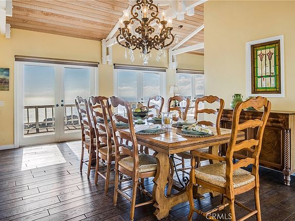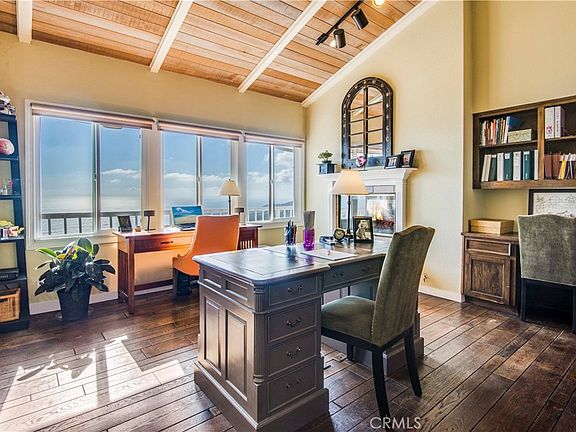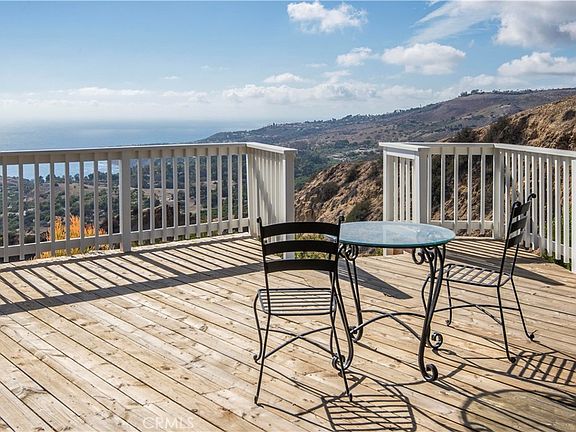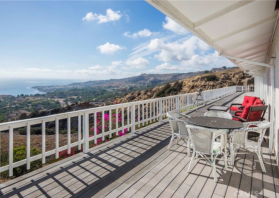 Enjoy panoramic ocean and Catalina views from most rooms of this charming home. The front courtyard has a huge wood deck and an oversized, outdoor fireplace. Once inside, the spacious kitchen features a center island along with breakfast area. The adjacent formal dining room opens to the expansive great room with beamed ceilings. The office has vaulted ceiling and is perfectly positioned in the center of the house. Three spacious bedrooms, include the Primary suite with private bathroom. The cozy fourth bedroom is located just off the garage. The South side of the home has an expansive deck to take in the panoramic views. Located at the end of a quiet cul-de-sac in the "Flying Triangle" area of Rolling Hills, the house was placed on a raised steel foundation that was engineered for this type of location. There’s an overwhelming sense of peace and tranquility where nature takes center stage.