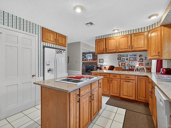 To the right of the entry, step down into a sunken family room with large windows that bathe the space in natural light—perfect for relaxing or entertaining. To the left, the second living area features a brick fireplace, creating a warm and inviting space that connects seamlessly to the casual dining area and updated kitchen with raised panel oak cabinetry, granite countertops, and built-in wall oven and microwave. A formal dining room just off the kitchen adds elegance for holidays or special occasions. Upstairs, you’ll find four spacious bedrooms, including an oversized primary suite with a private ensuite bathroom and walk-in closet. A finished basement adds a versatile recreation room and ample storage space, offering room to grow, play, or work from home.