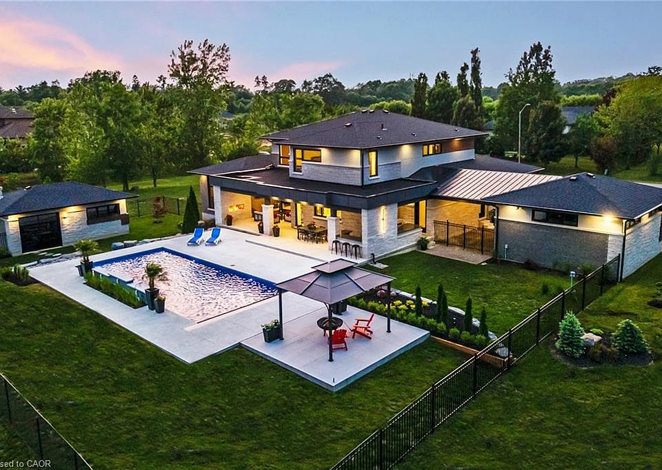 Discover unparalleled luxury in this custom-built modern masterpiece on a sprawling 1.6-acre estate in one of Dundas' most exclusive neighbourhoods. Enjoy the tranquility of a private country retreat just minutes from downtown Dundas and a short drive to Ancaster, Burlington, and McMaster. This stunning home offers over 6,000 sqft of exquisitely designed living space with 4+1 bedrooms and 7 bathrooms. From the striking architecture and custom millwork to the warm ambiance created by designer fixtures, soaring ceilings, 4-foot porcelain tiles, and ¾-inch engineered hardwood, every detail will impress. The dramatic 19-foot great room features floor-to-ceiling black frame windows with automated blinds and a sleek gas fireplace wrapped in 10-foot porcelain slabs. The chef’s kitchen is a showstopper, equipped with top-tier appliances, quartz countertops, a waterfall island, built-in espresso bar, and a hidden walk-in pantry for a clean, streamlined look. The main-floor primary suite offers a spa-like retreat with a five-piece ensuite including heated floors, glass shower, freestanding tub, double vanity, and an oversized walk-in dressing room with custom organizers. Upstairs, three bedrooms each have unique ensuite baths and 9-foot ceilings, ensuring privacy and comfort. The finished lower level expands your living space with a full secondary kitchen, recreation room, gym or guest bedroom, full bathroom, and a soundproof home theatre—ideal for entertaining or multi-generational living. Car enthusiasts will value the 5-car garages with a car lift, alarm system, and heated bay for year-round comfort. Outside, relax in your resort-style oasis with a heated saltwater pool, outdoor family room & kitchen, and full bathroom. A custom garage-style shed and pool house enhance the property’s sleek design. Additional features include a whole-home 20KW generator, Control4 smart home automation, and electric car rough-in. This estate is more than a home—it’s a lifestyle!