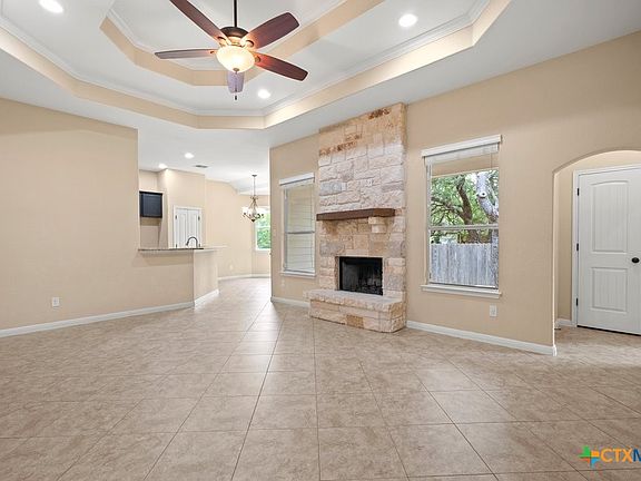 Tucked away on a quiet cul-de-sac in Woodcreek, this Hill Country charmer blends everyday comfort with natural elegance. 6 Stepping Stone Court welcomes you with native stone masonry, a charming front porch, and beautifully refreshed landscaping that sets the tone from the curb. Inside, the open-concept layout features high ceilings, recessed lighting, and thoughtful details like tray ceilings, arched entryways, and a striking floor-to-ceiling limestone fireplace. The kitchen offers granite counters, a breakfast bar, and rich espresso cabinetry that adds warmth and contrast. A cozy breakfast nook overlooks the backyard, creating a perfect spot for casual dining. The spacious primary suite features vaulted ceilings, a soaking tub, double vanity, walk-in shower, and his-and-hers closets. A front flex room with wood floors and ample natural light works beautifully as a home office or guest space. Just above the garage, a finished bonus room adds flexibility for a media space, gym, or creative retreat. Out back, enjoy a peaceful stone patio shaded by mature trees and complete with a built-in playscape—ideal for morning coffee or evening get-togethers. Just minutes from the golf course and downtown Wimberley, this home offers the best of Hill Country living with everyday convenience.