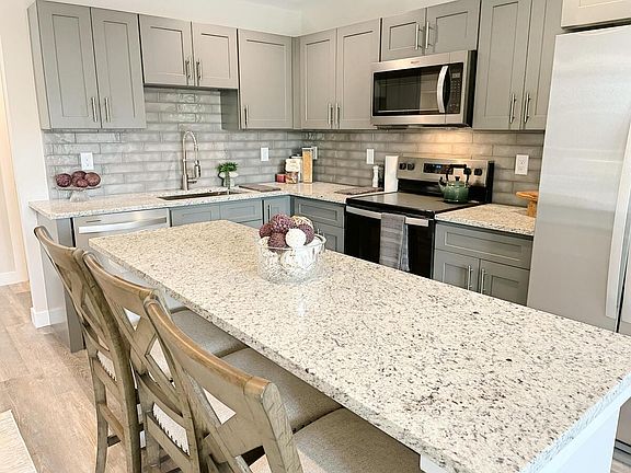 Appliances: Stainless steel refrigerator, over-the-range stainless steel microwave, stainless steel dishwasher, and oven/range.