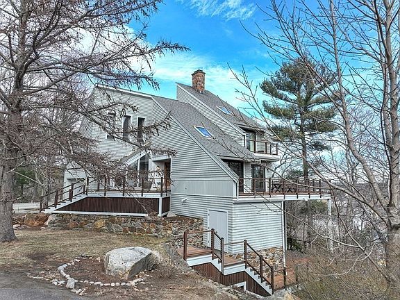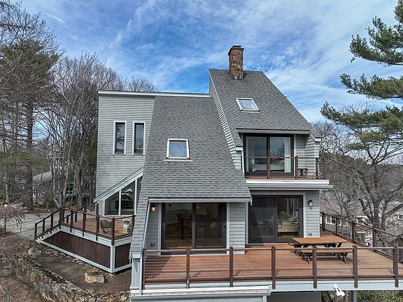 Bright, spacious California Contemporary has a dramatic hillside position, providing views of the village, harbor and ocean. A welcoming tiled foyer leads to the large living room, complete with cathedral ceilings, wood burning fireplace, walls of glass and handsome wood floors. A full length deck runs from the living room to the kitchen. The dining room enjoys harbor views and flows seamlessly into the well-equipped eat in kitchen with excellent cabinet space. The second floor has two bedrooms with lofts, ample closet space, wall to wall carpeting, and a shared bathroom. The primary suite features library/home office, fantastic bedroom with loft and private deck, walk-in closet and oversized bathroom with shower, jacuzzi and treetop views. The above-grade lower level family room has w/w carpet, and excellent storage. Two car garage, great additional storage for gardening tools/kayaks; very private yet a quick stroll to the village, commuter rail and Singing Beach!