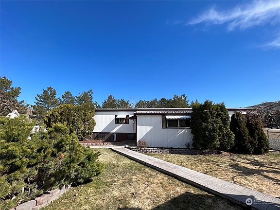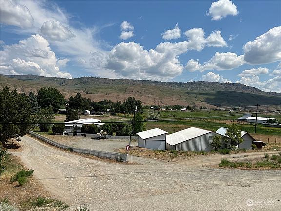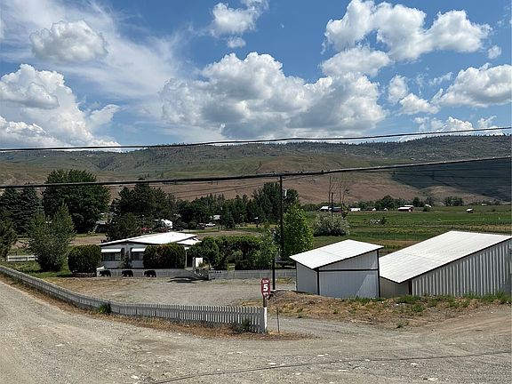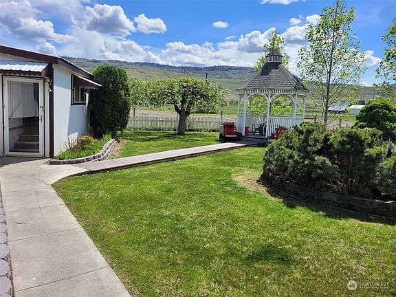 Okanogan - Beautiful 360 Degree Mountain Views - Over 3 acres Manufactured Home with 3 Bedroom/1.75 Bath. Attached entryway leading to living room, kitchen with custom cabinetry & all appliances stay, dining room, 2 bedrooms, 1 full bathroom with double vanity sink, primary room with three-quarter bath en-suite, and sliding door off dining room area leading to outside mudroom and back entry access to yard. Beautifully maintained yard with gazebo. Multiple outbuildings including oversized shop, storage sheds, & woodshop all with power. Less then 5 minutes from downtown Okanogan, grocery store, restaurants, retail shopping, and more. Completely fenced pasture. Septic. Shared Well. CASH ONLY $199,000 MLS-2047255/H-3128