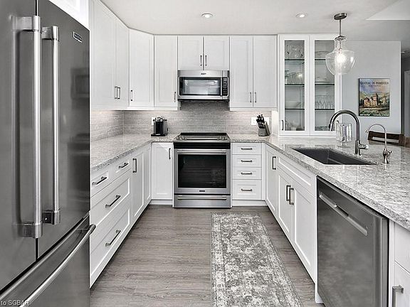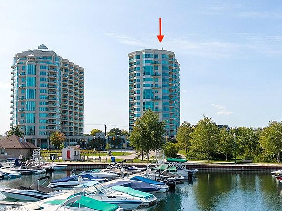 QUICK CLOSE AVAILABLE! Stunning, updated penthouse with private balcony and spectacular views of Barrie's downtown waterfront, marina and Kempenfelt Bay. Thoroughly updated in 2018 including new luxury vinyl plank flooring, custom cabinetry throughout to maximise the use of space, new hardware and interior doors, renovated bathrooms and more! The open plan living, dining and kitchen space boasts water views, walkout to a private balcony with panoramic views of the marina and downtown Barrie, 8ft and 10ft coffered ceilings and attractive crown moldings. The kitchen features an oversized peninsula with storage, Cambria quartz countertops, new tall cabinetry (2018), high end appliances and food pantry. You'll also find a den, in suite laundry room, guest bedroom with water views, shared 3pc bathroom and luxury master suite. The spacious master suite offers a good size walk-in closet with custom built ins/drawers, views of the lake and updated 4pc spa like ensuite with freestanding tub, vanity, large glass and tile shower. The building comes with on site amenities including a large indoor pool, spa, sauna, change rooms and fitness room with up to date equipment, conveniently located storage locker and one indoor parking space. Enjoy everything Barrie has to offer including award winning restaurants, shopping, beautiful waterfront, parks and just 50 minutes from Toronto Pearson Airport! Covid 19 protocols in place.