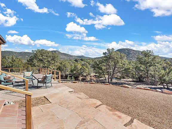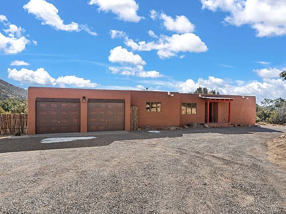 This enchanting 3 bedroom, 3 bath home nestled on 2.25 tranquil, tree filled acres located in the Sangre de Cristo foothills and just ten minutes to downtown Santa Fe, has been extensively renovated from top to bottom. This property is as close to a new build as you can get. Perfectly sited at the end of a cul-de-sac with privacy and mountain views, this home is just five minutes from some of Santa Fe's most popular restaurants and in close proximity to I-25 for easy commuting. Inside this re-envisioned and enlarged home, you'll find two primary ensuite bedrooms in addition to a well-separated office or third bedroom, new bathrooms, kitchen, cabinetry, appliances, flooring, and lighting. Five new ductless mini-splits and three wood burning fireplaces provide efficient heating, cooling and ambiance for year-round comfort. In addition, this property boasts an impressive, eco-friendly trombe wall. Utilizing green energy principles, the trombe wall features solar-powered illumination, contributing to the property's dedication to modern, sustainable solutions providing peace of mind for eco-conscious buyers. There is also a new septic system, new roof with a twenty-year warranty, and an updated electrical system that ensures modern safety and reliability, providing a worry-free living experience for the new owners. Unique, artistic details are found throughout the property including lovingly restored carved wooden doors, hand-stenciled, reverse glass painted entry closet door, stained glass windows and a fabulous stone walkway and patio with new fencing. Come discover the charm and allure of this exceptional real estate offering!