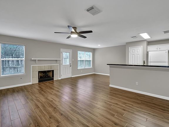 Beautiful end-unit townhome in great location that is nestled against a wooded greenbelt. This move-in ready home has a light and bright kitchen with newly updated countertops and ceramic tile flooring throughout the 1st level, stairs and hallway. The kitchen opens into a cozy family room with a gas log fireplace. Spacious master suite includes double sinks, soaking tub with separate shower, and a walk-in closet. This home boasts a convenient upstairs laundry room as well. Washer, dryer and refrigerator included! Enjoy the private and fully fenced backyard with plenty of space for entertaining. Located in a quiet, wooded community within walking distance to HEB and convenient access to I-45, FM 1488, Woodlands shopping, and walking trails. Pets are allowed on a case-by-case basis.