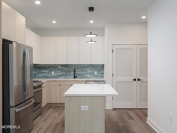 Experience modern coastal living at Tak House in Long Branch's vibrant West End. Unit 301 features 2 bedrooms plus a den, 2 full baths, 9' ceilings, in-unit laundry, and two dedicated parking spaces. The open kitchen features custom cabinetry, quartz countertops, center island, and stainless steel appliances. Direct elevator access to the rooftop deck with ocean views, lounge seating, and TV. Building amenities include keyless entry, package/grocery delivery system, bike storage, beach lockers, and EV charging stations. Just minutes to the beach, shops, dining, and NYC transport.