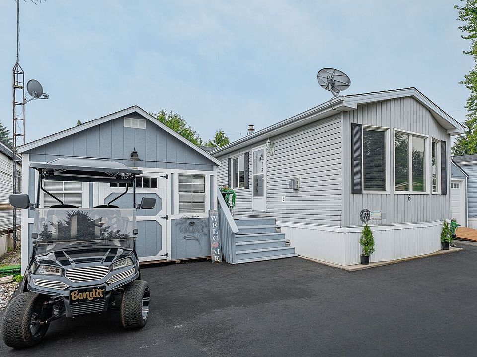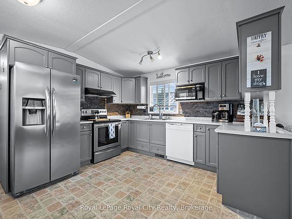 Fall in love with the Mini lakes lifestyle. This charming home is located in a year round gated community and is perfectly situated on a quiet, private lot where the outdoor living is just as inviting as indoor living. Unwind under the gazebo on the deck, lounge on the patio listening to the breeze in the trees, or stargaze on clear nights, this is relaxation at its best. Inside, you'll find all the comforts of home with plenty of charm, including a cozy natural gas fireplace with a beautiful stone surround and mantel. The open-concept living area is ideal for entertaining or simply enjoying everyday life, whether you're cooking dinner or catching up on your favourite show, you're always part of the conversation. Down the hall, the primary bedroom is peacefully tucked away at the back of the home, perfect for sleeping with the window open letting in the fresh country air. A well-appointed bathroom with a bright skylight sits conveniently between the primary and second bedroom, offering privacy and functionality. But the true magic of Mini Lakes lies beyond your door. Explore scenic canals, creeks, and the lake perfect for floating, paddling, or simply soaking up the sun. Invite friends and family to the heated pool for lazy afternoons, and don't miss the annual kids' fishing derby, a local favourite. With a vibrant community spirit and activities for every interest-bocce, cards, darts, golf tournaments, walking clubs, and more you'll never run out of things to do. The driveway has been freshly paved and there is plenty of room to park your GOLF CART, which is available to purchase or MAY BE INCLUDED IN THE SALE! Whether you're looking for a peaceful retreat or a fun-filled lifestyle, this home and Resort Style Community have it all.