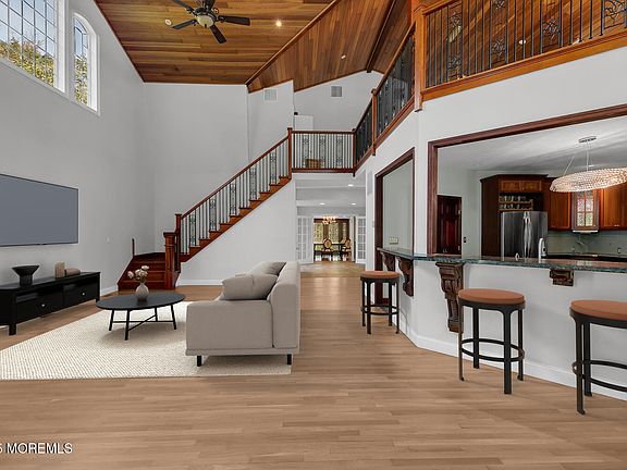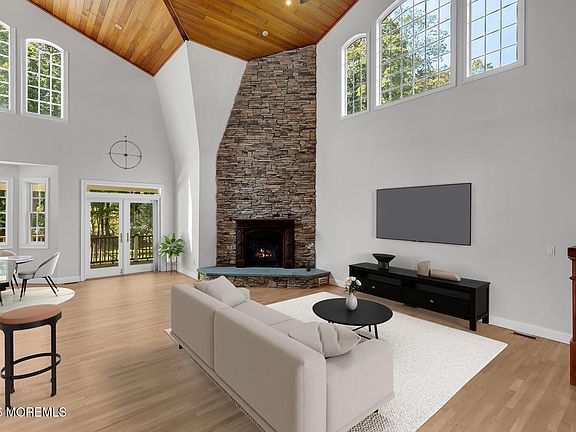 You're going to fall in love with this exceptional home! This beautiful custom farmhouse welcomes you with a wrap-around covered porch and an expansive open-concept floor plan designed for modern living. Throughout the home, soaring ceilings, exquisite millwork, and oversized windows create a bright, elegant atmosphere filled with natural light. The impressive great room features a dramatic double-height ceiling adorned with custom woodwork, rich hardwood flooring, and a cozy gas fireplace — seamlessly connected to a stunning chef's kitchen with furniture-quality cabinetry, a spacious center island, stone countertops, walk-in pantry, and charming breakfast area. Entertain in style in the large formal dining room with French doors, or unwind in the richly finished den highlighted by beamed ceilings and a handsome gas fireplace. A first-floor bedroom suite with a beautifully updated, spa-inspired full bath offers ideal accommodations for guests or multigenerational living. Upstairs, the luxurious primary suite impresses with custom built-ins, a generous walk-in closet, and a tastefully lavish en-suite bath featuring an oversized glass-enclosed shower, soaking tub, and dual sinks. A versatile adjoining bonus room provides the perfect space for a sitting area, home office, or private retreat. Additional spacious bedrooms share a beautifully updated full bath with custom tilework. Thoughtful details include abundant closet space throughout, a second bonus room, a walk-in attic for easy-access storage, and a finished lower level offering additional flexible living or storage options. Set in highly sought after Holmdel on a beautifully private property offering tremendous serenity, the home also includes a charming barn currently used for storage a space brimming with potential for future creative uses. Biking distance to Cross Farm Park, and minutes to shopping/dining, GSP, and Red Bank!