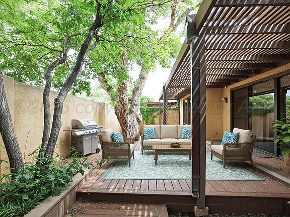 A Gated Entry With Brick Pavers Across From Amarillo Country Club And Golf /Tennis Club Welcomes You To This Charming Townhome, Offering Both Elegance And Privacy. The spacious courtyard sets the stage for serene outdoor living. Inside, large windows fill the home w/ natural light. A highlight is the generous storage found throughout. The living area boasts a vaulted ceiling, a cozy fireplace, & built-in cabinets, while the formal dining room accommodates a large table for gatherings. The kitchen is a chef's delight, featuring a stunning tile backsplash, quartz countertops, a walk-in pantry, & a silver cloth cabinet. A bright breakfast area is perfect for everyday meals. The primary suite impresses w/ a striking herringbone wood floor, a wall of bookshelves,& an en-suite bath offering 4 closets,a linen closet, a safe, a glass-door shower, & a soaking tub. The office is a peaceful retreat w/ built-in bookshelves & a sunlit bay window. Enjoy Plantation shutters and custom electric shades in the home. Upstairs, the second & third bedrooms each feature beautiful wood floors & ensuite baths w/ walk-in closets. Outdoor entertaining is effortless on the patio's Trex deck, making this home as inviting as it is functional.