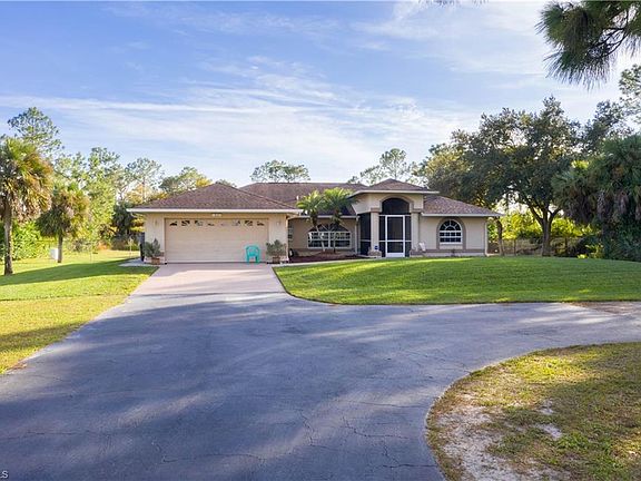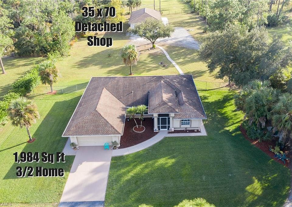 Welcome to Golden Gate Estates. Embrace the possibilities of having a home and shop on 3.09 pristine acres, already cleared, fenced and gated. This 3-bedroom, 2-bath home blends comfort and function with tile throughout and vaulted ceilings. The updated Cornerstone kitchen features custom cabinetry, two pantries, and a hidden storage nook. The primary suite offers two walk-in closets and a spa-like bath with soaking tub and walk-in shower. Pocketing sliders open to the screened lanai and view of the huge backyard, ready for any size pool you can imagine. A 2017 roof, 2025 A/C and hurricane shutters provide peace of mind. The 35x70 CBS shop has four 12-foot doors allowing easy pull-through for large trailers and RVs. Not just for storage, this shop is set up for work; with a car lift, air compressor and power hookups along both side walls and there’s even a paint booth. Outside the shop there’s plenty of room to maneuver long trailers and a reinforced gravel parking area for a larger motorhome. At the rear of the property you’ll find a shooting range and a berm along the property line to create a landscaped buffer from Immokalee Rd. Located in a highly sought-after section of Golden Gate Estates, off Wilson Blvd north of Immokalee Road. Just one intersection away from the nearest Publix shopping center and fire station.