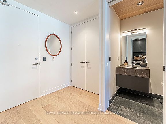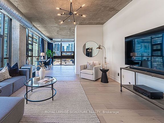 Welcome to a rare urban masterpiece in the heart of King West. This fully renovated loft-style condo offers 1,081 square feet of designer living space with every detail carefully curated for those who demand the finest. Step inside to soaring exposed concrete ceilings, sleek white oak flooring, and floor-to-ceiling windows that flood the home with natural light while framing iconic views of the CN Tower. Automated Hunter Douglas blinds and high-end blackout curtains covering every window (combined value of $40k) add both convenience and sophistication. The open-concept layout is anchored by custom cabinetry and luxury finishes throughout, creating a space that is as functional as it is striking. A Juliette balcony brings in fresh air, while the crown jewel of this property awaits above-a stunning rooftop patio with wraparound views of Toronto's skyline, the perfect backdrop for entertaining or quiet evenings under the stars. Low maintenance fees, boutique living, and a prime location at King & Bathurst put you steps from Toronto's best dining, nightlife, and cultural experiences. This is more than a condo-it's a statement of style, comfort, and city living at its best.