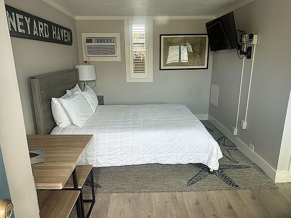This is an investment property that also allows for easy getaways to the island of Martha's Vineyard. A beach front condo complex that is a short walk to downtown Vineyard Haven, the ferry, fine dining, shopping, movies theaters, and is right on the VTA bus route. This second floor unit has a private full bath, queen bed, built in flat screen TV, mini refrigerator, and wall A/C unit. The efficient management team makes it easy by doing all the work. They clean it, they rent it, they keep flowers blooming in the courtyard and always have the beach ready to relax. As the owner, you let management know what days you would like to spend in you condo, then they rent the remainder of the days, take a percent for cleaning and expenses and then profits are all yours. Room comes furnished.