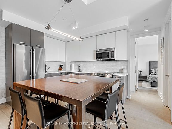Experience elevated living in this stunning lower penthouse suite, thoughtfully upgraded throughout for modern comfort and style. This 2-bedroom, 2-bathroom residence offers rare privacy with only 3 neighbours on the floor, and includes a premium parking space, locker, and 2 private balconies. Step inside to find to find 9' and 10' smooth ceilings, 8-ft solid core doors, a striking entry feature wall, and custom lighting that sets the tone for luxury. The heart of the home features a large custom millwork island and upgraded full-sized JennAir appliances - perfect for entertaining. Enjoy the richness of engineered hardwood flooring, custom closet organizers throughout, and roller blinds for a sleek, modern finish. The spa-inspired bathrooms boast a frameless glass shower and upgraded plumbing fixtures. Located steps from public transit and minutes to major highways, this turnkey penthouse offers the perfect blend of convenience and upscale urban living. You won't want to miss this one!