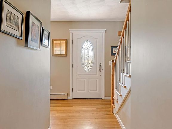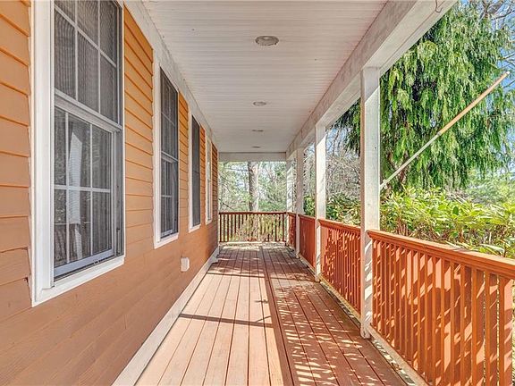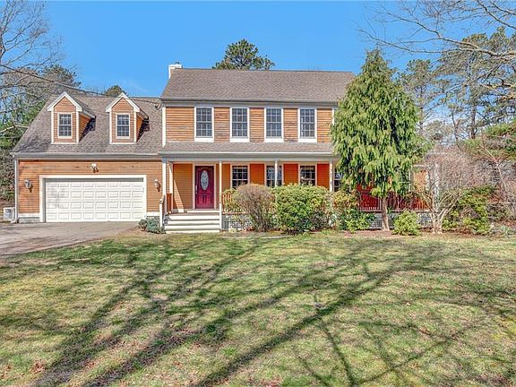 60 Blue Ridge Drive is a 2003 Colonial on a 2.36 acre lot located on a bucolic cul-de-sac in Charlestown--close to New Burlingame Park, Watchaug Pond and 9 miles to the beach. This 4 bed and 3.5 bath home is on two floors and offers 2,528 sqft of living space. The basement is also finished, offering another 775 sqft of space, including full bath, laundry room, rec room and storage. The main level living space flows nicely--an open-concept kitchen, dining room and family room complete with fireplace. These rooms connect to a back deck, side door to a porch, plus a formal living room, half bath and an integral two car garage. The kitchen has maple cabinets, tile floor and stainless appliances. The remainder of the first level flooring is hardwoods. The second floor encompasses a spacious primary suite, two more bedrooms that share a bath, plus a bonus room over the garage which can be a 4th bedroom, playroom, exercise space or home office. Septic, well-water, oil-fired baseboard heat (no AC). The home is set back from the street, has a front farmer's porch, and a small portion of the backyard is fenced. This home and lifestyle offers a lot for the money.
