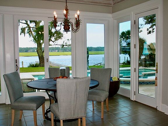 One of the nicest double waterfront lots on Brams Point Peninsula. 1.1 acres, fronting on the intercoastal waterway in the front and the deep waters of Broad Creek in the back with a deep-water dock that will accommodate yachts up to 65 feet. One of the very few homes on the peninsula that has private sandy beach access. The open floor plan allows for front-to-back water views.