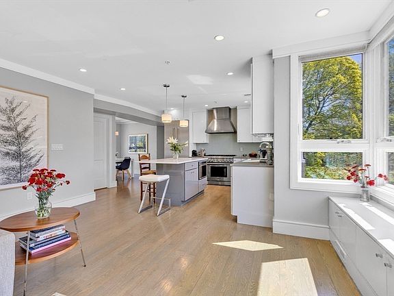 Stunning, elegant built in 2015 condo! The sunny floor through unit offers open layout, direct elevator into the unit from garage parking.Three bedrooms, two full bathrooms, a spacious open living room with wall of windows and gas fireplace. Dining room that fits full size dining table is perfect for Holidays and Family Dinners. You will enjoy cooking in this beautifully appointed kitchen with SS appliances, six burner gas range, oversized professional-grade hood, lot’s of counter space and large island. Oversized primary bedroom has walk-in closet, wall of custom built closet cabinets! Large primary bath has heated floors, double vanity and steam shower. Hydro central heating and A/C system with two control zones. Pre-wired for entertainment sound system. Private stone patio, two exclusive parking spots, guest parking. Close to D-line Stop, Brookline High School, Lincoln Elementary School, Boylston Street playground, Brookline Village, Longwood Medical.