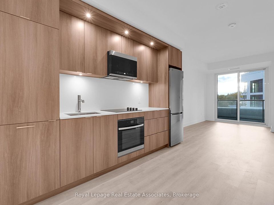 Beautiful and functional one-bedroom plus den suite at The Westerly 2, showcasing light, modern finishes and a bright open layout. The contemporary kitchen features warm wood cabinetry, under-cabinet lighting, quartz countertops, a built-in cooktop, oven, and full-size stainless-steel fridge. The spacious living and dining area opens to a large private balcony with a serene courtyard view. A separate den offers an ideal work-from-home or study space. The bedroom features floor-to-ceiling windows and a large closet, while the sleek four-piece bathroom and in-suite laundry complete this well-designed suite. Residents of The Westerly 2 enjoy access to premium amenities including a fully equipped fitness centre, yoga studio, co-working lounge, party and entertainment room, outdoor terrace with BBQ and dining areas, 24-hour concierge, and visitor parking. Conveniently located steps to Islington Subway Station, Bloor Street shops and cafes, and minutes to Sherway Gardens, parks, and major highways with easy access to Downtown Toronto.