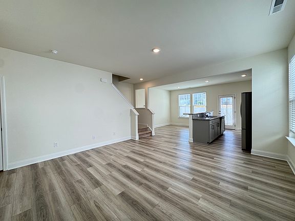 End unit townhomeLarge bright family roomGranite countertopsOne car garageOpen concept kitchenWhite cabinetsDining area