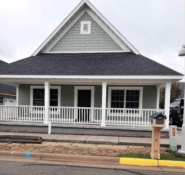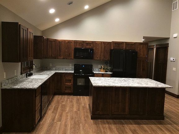Interior Living room, dining room, and kitchen have cathedral ceilings. Main floor ceiling height is 8 ft. Gas fireplace in the living room with custom made mantel and fireplace surround. Knotty Alder kitchen cabinets. Bathroom vanity and laundry room cabinets are Knotty Alder. Quartz tops in kitchen and in bathrooms, Formica countertops in laundry room. Knock down on side walls and ceilings. Custom trim around windows, doors, and baseboard. Knotty Alder craftsman style interior doors with handicapped lock handles. Luxury vinyl flooring, carpeted bedrooms, ceramic tile bathroom floors. Handicapped accessible master bath. Ceramic tile walk-in shower in master bath. White fiberglass tub/shower in main bath. 4 ft. wide hallways for easy access. Garage Measures 24' x 28' w 16' x 7' overhead door. Steel service door to outside. Walls and ceilings are taped and painted. Windows and doors are trimmed with casing and baseboard. Exterior Asphalt shingles. Aluminum soffits. Smart trim and siding. Each painted with 2 coats of Duration (Sherwin Williams). Shakes on gable ends. Marvin double hung windows w/grills to match rest of houses in village. Insulated concrete blocks used for all exterior foundation walls. One inch sprayed foam and cellulose insulation in attic. Blown in hard pack insulation in side walls. In ground sprinkler system. Landscaped.