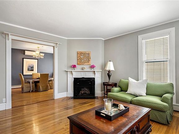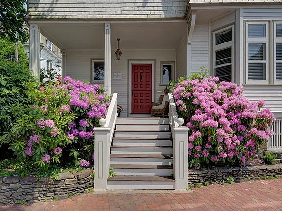 Welcome to the Charles Hammett House, a distinguished historic residence in Newport’s coveted Historic Hill neighborhood. Before stepping inside, pause on the charming front stoop and enter through iconic red Dutch door into a home rich in character and modern comfort. You're greeted by a dramatic staircase with built-in light fixture and stained-glass windows. The inviting living and dining rooms each feature gas fireplaces, perfect for cozy gatherings. The kitchen includes stainless steel appliances, generous countertops, and French doors leading to a private rear patio—an outdoor oasis centered around a custom stone fireplace. Upstairs, the primary suite offers a gas fireplace, ample space for a king-sized bed, and a luxurious en suite bath with double vanity sinks, soaking tub, separate shower, and a gas stove for added ambiance. Two additional bedrooms and a full bath complete this level. Currently configured as a legal two-family, the rental offers flexibility and income potential. Whether used as a rental, guest quarters, or easily converted back to a single-family home, this space adds significant versatility and value. Accessible from inside or a rear staircase—features a full kitchen, living area, bath with tub and shower, and in-unit laundry. Additional highlights include off-street parking for one vehicle, split-system air conditioning and an unbeatable location. Historic Newport living at its finest-where charm, comfort, and location come together.