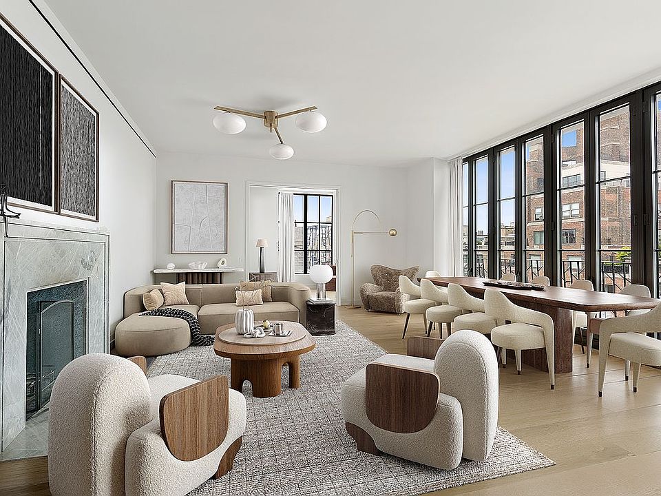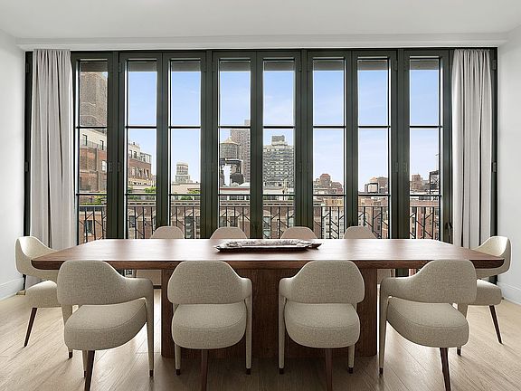 Welcomed by a modern private gallery, this full-floor residence features direct access to two keyed elevators, leading to a dramatic north-facing great room, complete with a Juliet balcony and wood-burning fireplace. The windowed kitchen features expansive Caldia marble counters, custom lacquer cabinetry, a stainless-steel Gaggenau appliance package (refrigerator, freezer, wine refrigerator, dishwasher, oven, and microwave oven), and ample storage.