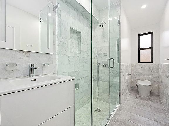Indulge in the brand-new bathroom featuring elegant marble tiles, a stand-in shower, and a Kohler smart toilet, offering a spa-like experience.