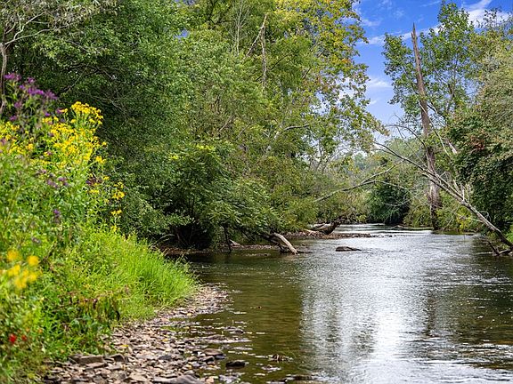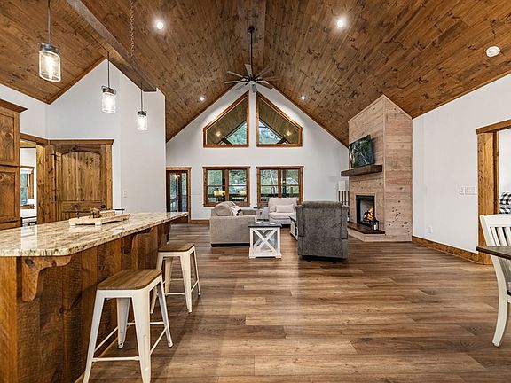 Rustic wood fireplaceSpacious primary suiteLarge islandOpen conceptStainless steel appliancesWalk-in closetRushing creek frontage
